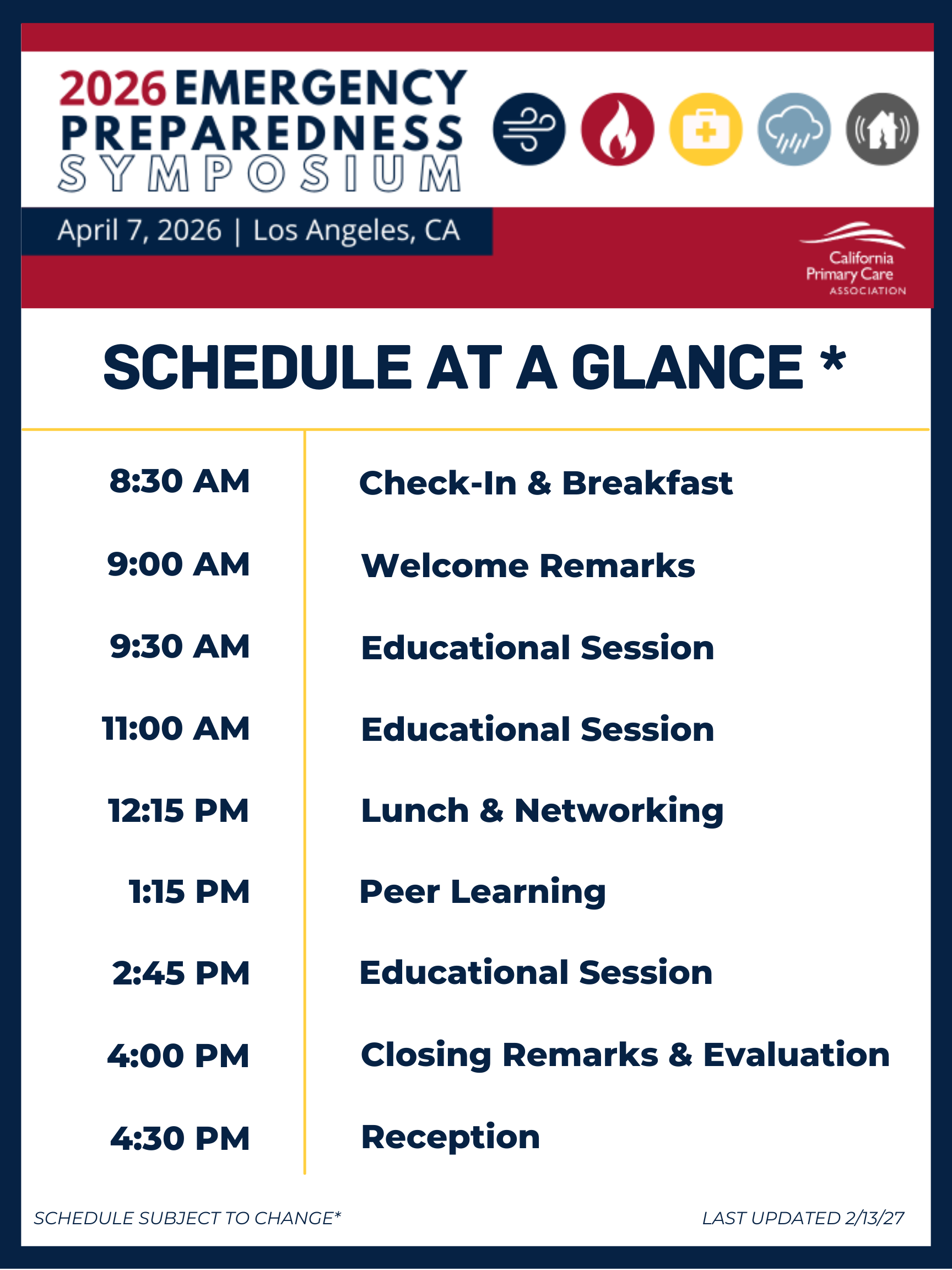 CPCA's Emergency Preparedness Symposium is designed to disseminate best practices and share innovative projects that directly relate to emergency and disaster preparedness at community health centers and clinics.