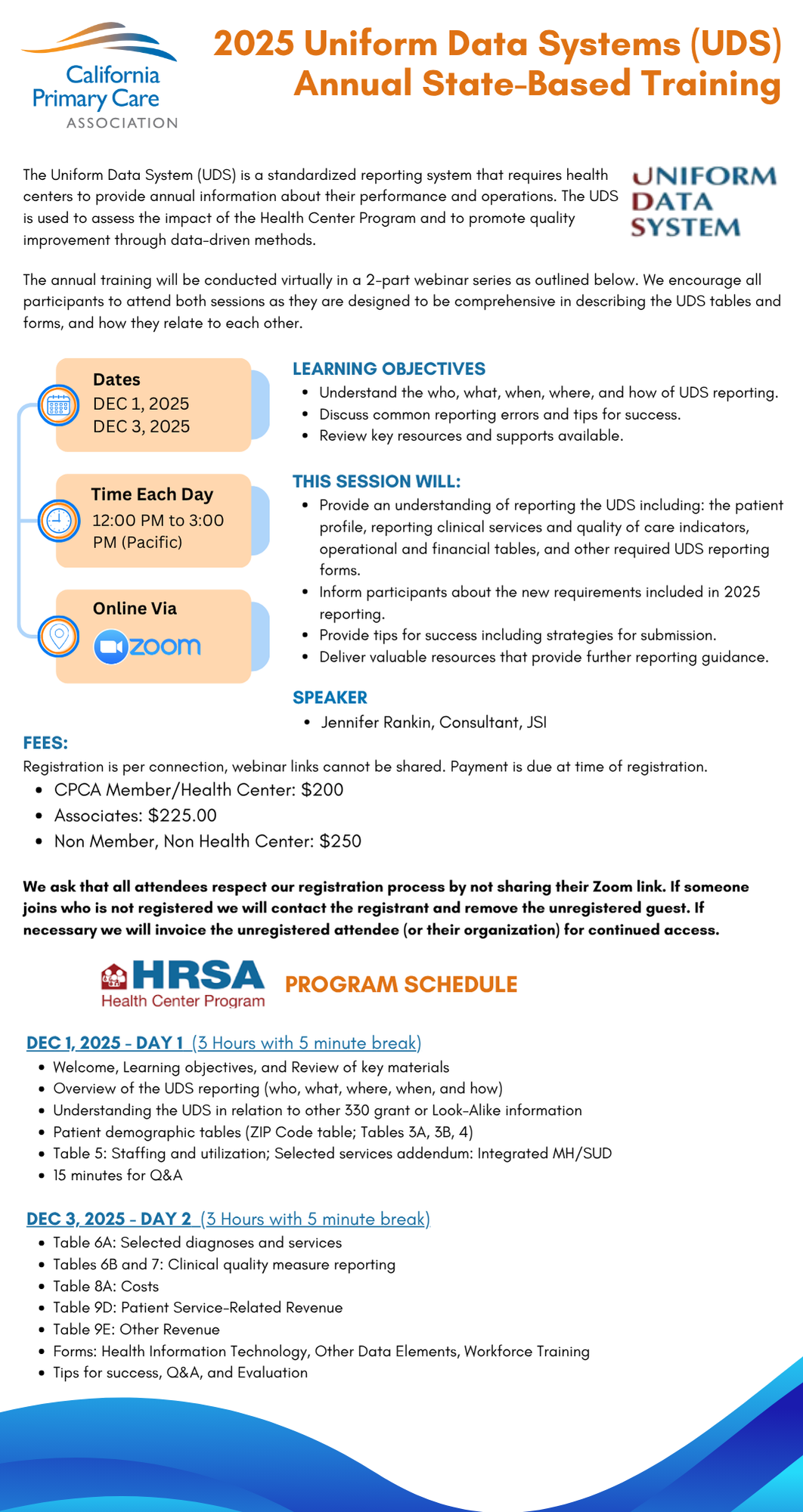 Registration is required for all CPCA training and events. You will receive two email communications immediately upon registering. The first is simply a receipt. The second from zoom.us, under CPCA Training or a CPCA staff member's name, will contain webinar access information. This email will only be delivered to the individual who is registered for the event and will contain a unique link for a single connection. We recommend you add this event to your calendar using the link contained in your webinar access email. If you do not receive this email, please check your spam/junk folders before contacting training@cpca.org.