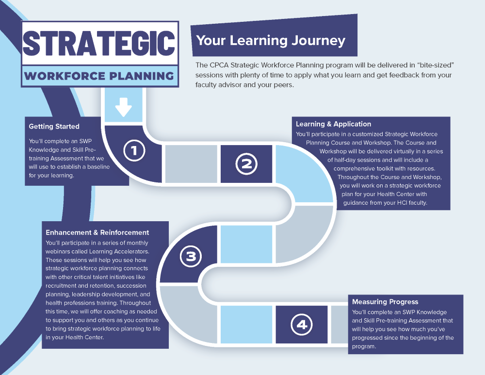 Forecast and plan the workforce your organization will need to succeed in the future. CPCA’s Strategic Workforce Planning (SWP) certification program is based on HCI’s (Human Capital Institute’s) industry-recognized SWP certification program but tailored to the unique needs of CHCs. The online program is delivered in “bite-sized” sessions over the course of several months so community health centers have sufficient time to apply what they learn and get feedback from their faculty advisor and peers. Participants obtain a professional development opportunity, in-depth knowledge on strategic workforce planning and a certificate of completion and qualify for SHRM recertification credits.