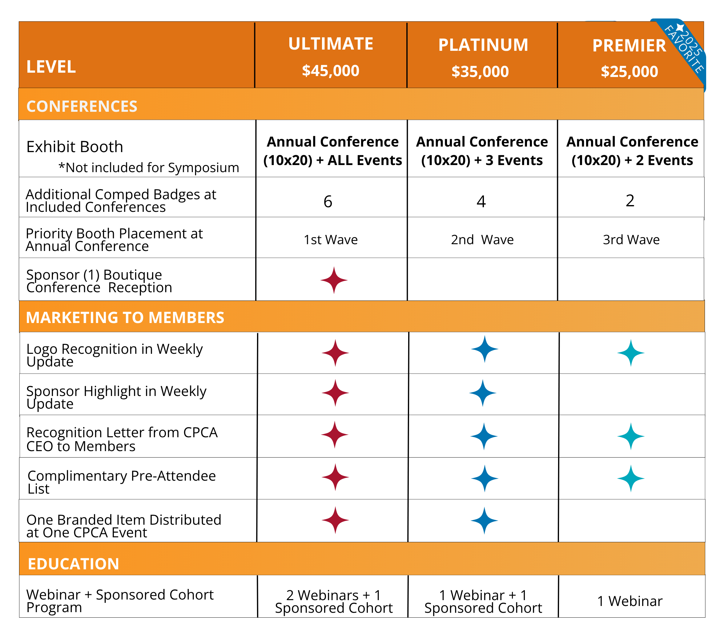 The Annual Sponsorship Program provides your organization a year-round presence and direct outreach with CPCA’s membership to help you: